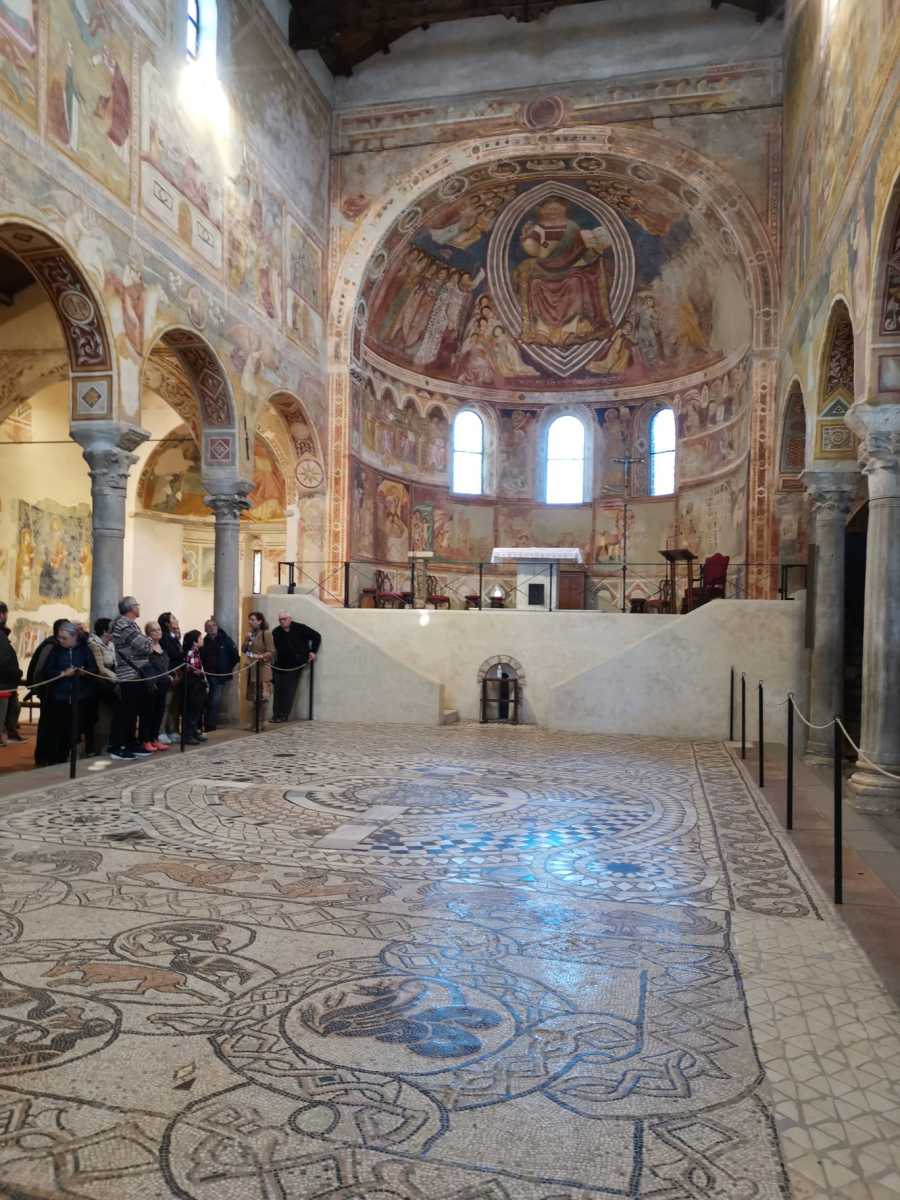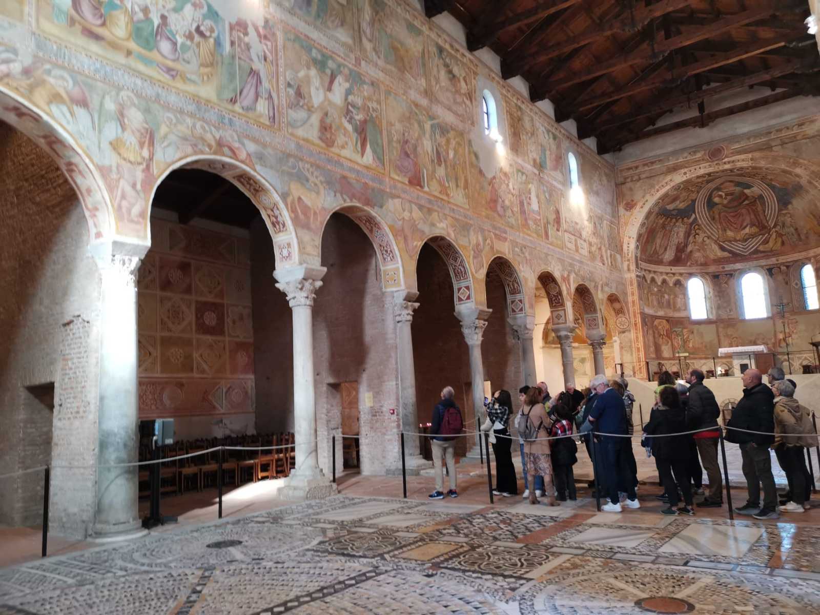 Sorprendente abbazia benedettina, straordinariamente ricca di affreschi giotteschi e pavinenti in mosaico, in mezzo alla sconfinata pianura del Polesine. La visita del complesso conventuale di Pomposa è stata la scoperta di un altro tesoro italiano poco visitato ma fortunatamente ben conservato nonostante tutti i passaggi di mano. Il nostro prezioso accompagnatore, il professor Cesare Alpini, davanti al ciclo di affreschi era estasiato, avrebbe voluto fermarsi più a lungo per analizzarli uno per uno. Comunque anche solo il colpo d’occhio d’insieme, dall’ingresso, ci ha lasciato a bocca aperta e occhi spalancati.